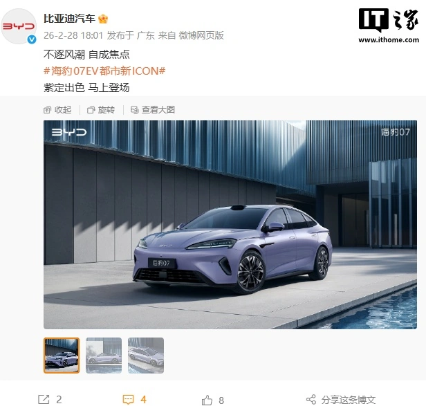 IT之家2月28日消息,2026款比亚迪海豹07EV确认将于近期发布,并将提供全新的紫色车漆可选,号称“都市新icon”。
